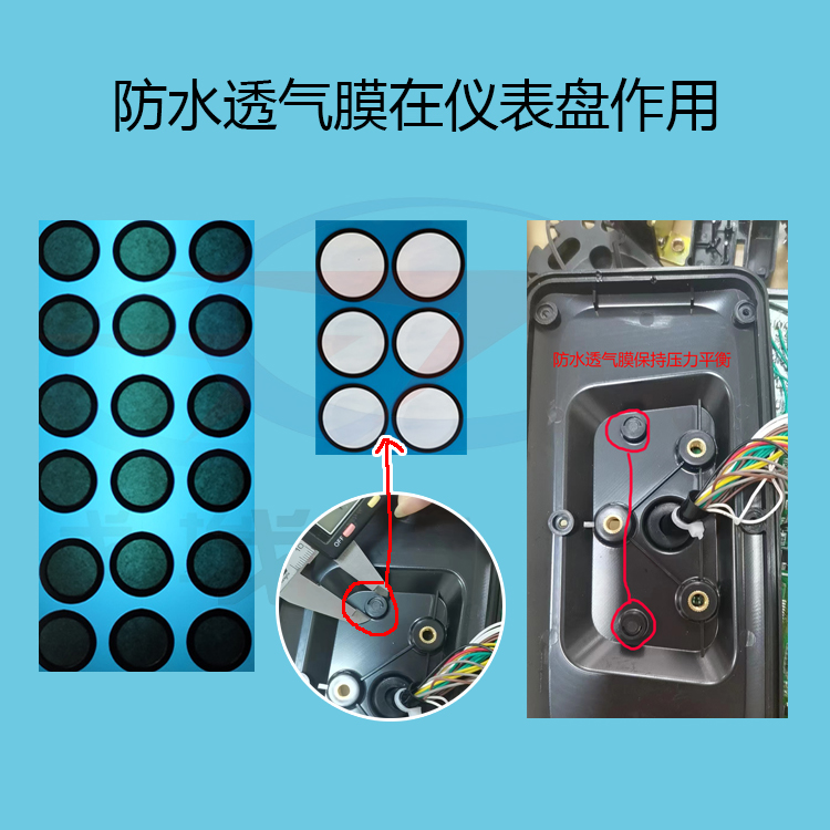 儀表盤中的電子元件在工作的時候,熱量就會在設(shè)備殼體內(nèi)部積聚,這樣導(dǎo)致壓力增大。如果沒有防水透氣膜泄壓排氣使得殼體內(nèi)外壓迅速平衡。從而達到儀表盤使用的壽命。